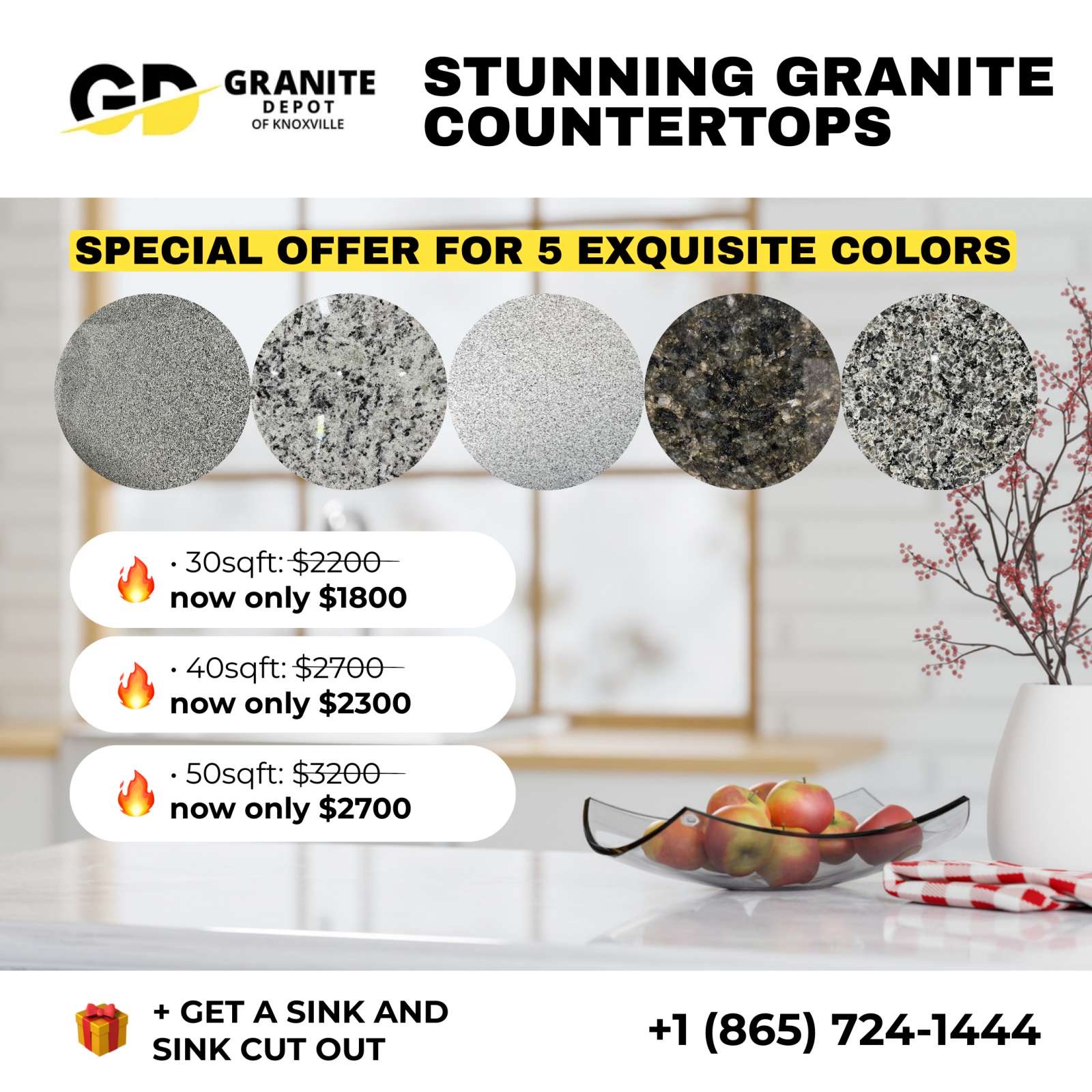 Choose the experts at Granite Depot of Knoxville. Our team of specialists can perfectly design the right quartz, granite, or marble countertop to match your style and fit your budget. We offer the fastest turnaround times in town! You’ll have your new counter installed and ready to enjoy in just 7 to 10 days.